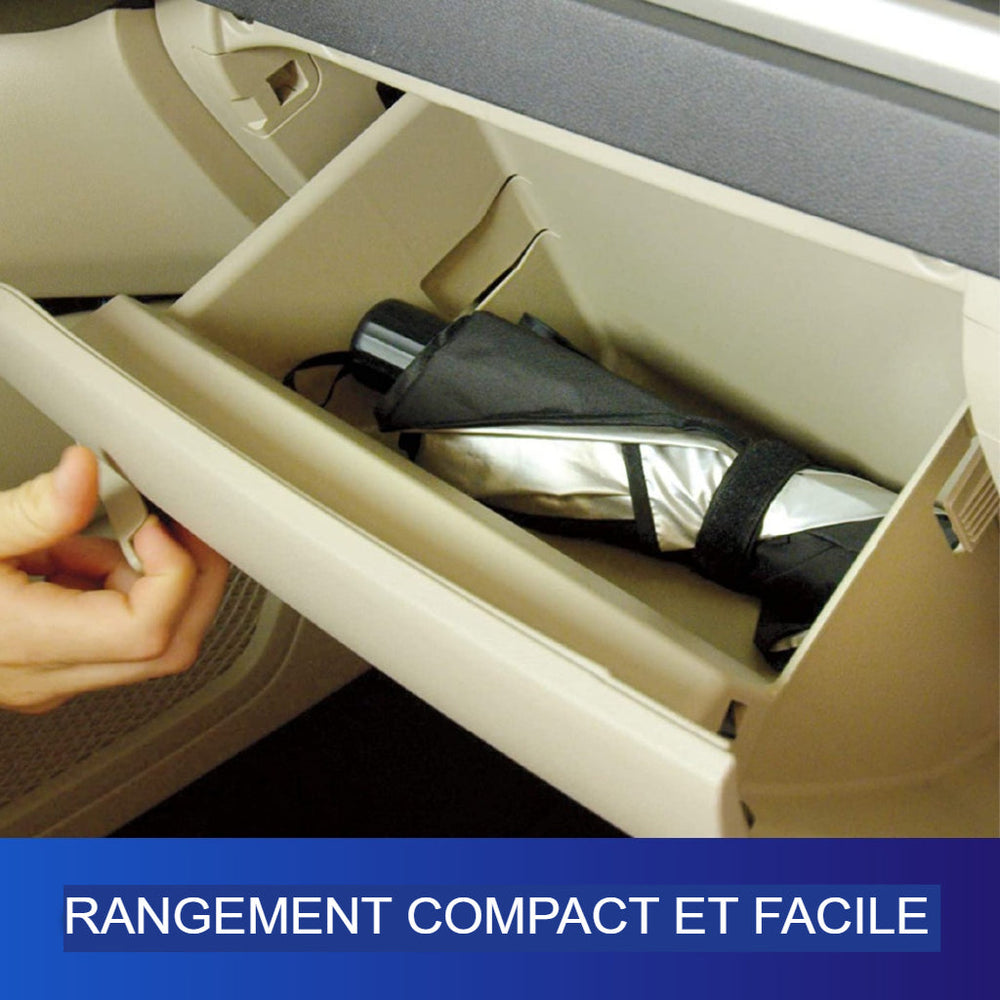 🚗 Installation sans effort, rangement sans souci ! Plus besoin de se battre avec des parasols encombrants ! Avec ce pare-soleil, c'est aussi facile que d'ouvrir un parapluie. Il suffit de l'ouvrir et de le voir se mouler sans effort à votre pare-brise. Lorsque vous avez terminé, un simple clic sur le loquet de verrouillage permet de le replier dans un format compact. Rangez-le dans votre boîte à gants, sur le panneau de porte ou sous le siège sans sacrifier un espace précieux !